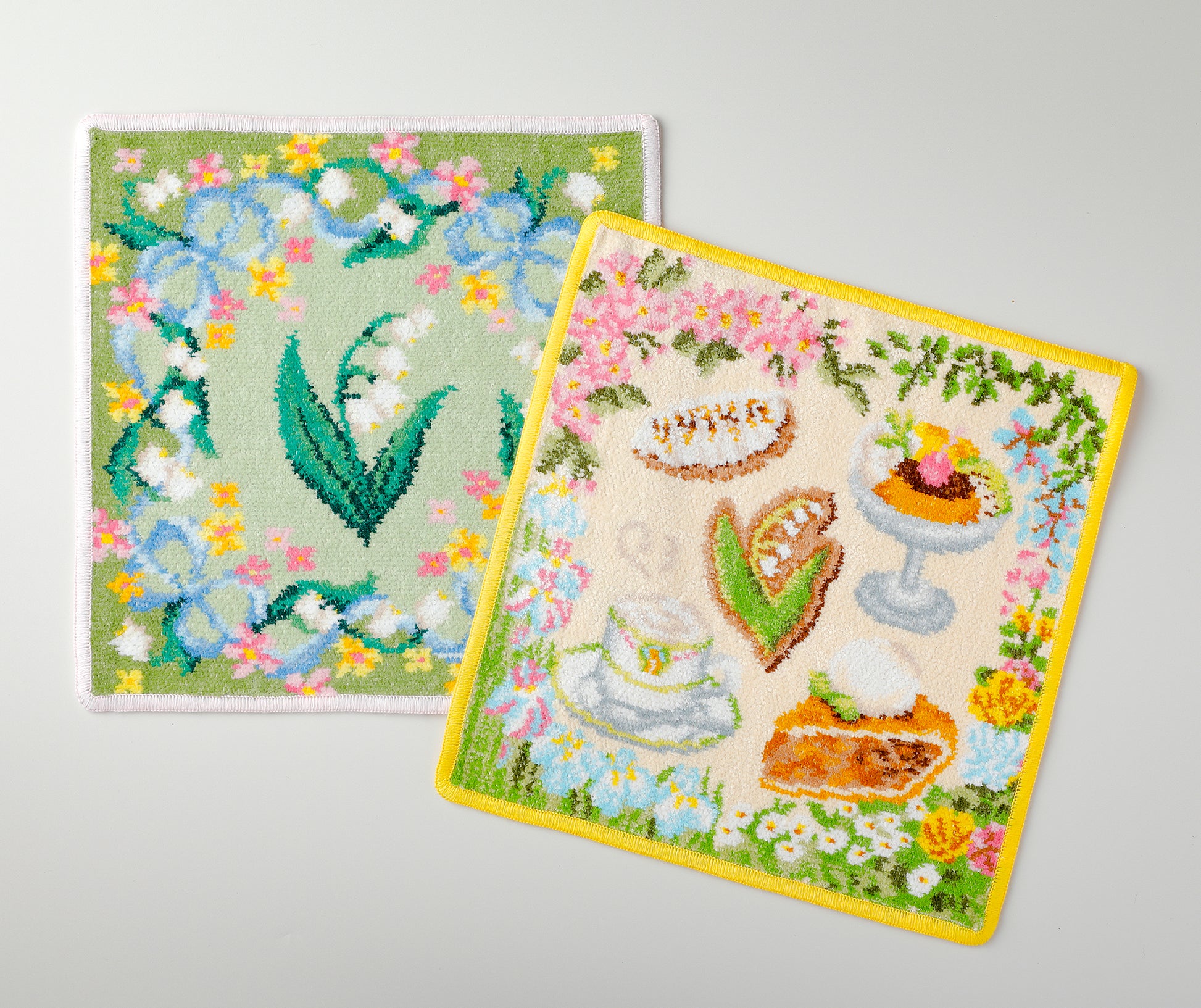 ロイヤルミルクティーにアップルパイ、すずらんクッキーやプリンなど、万平の人気スイーツがハンカチに。