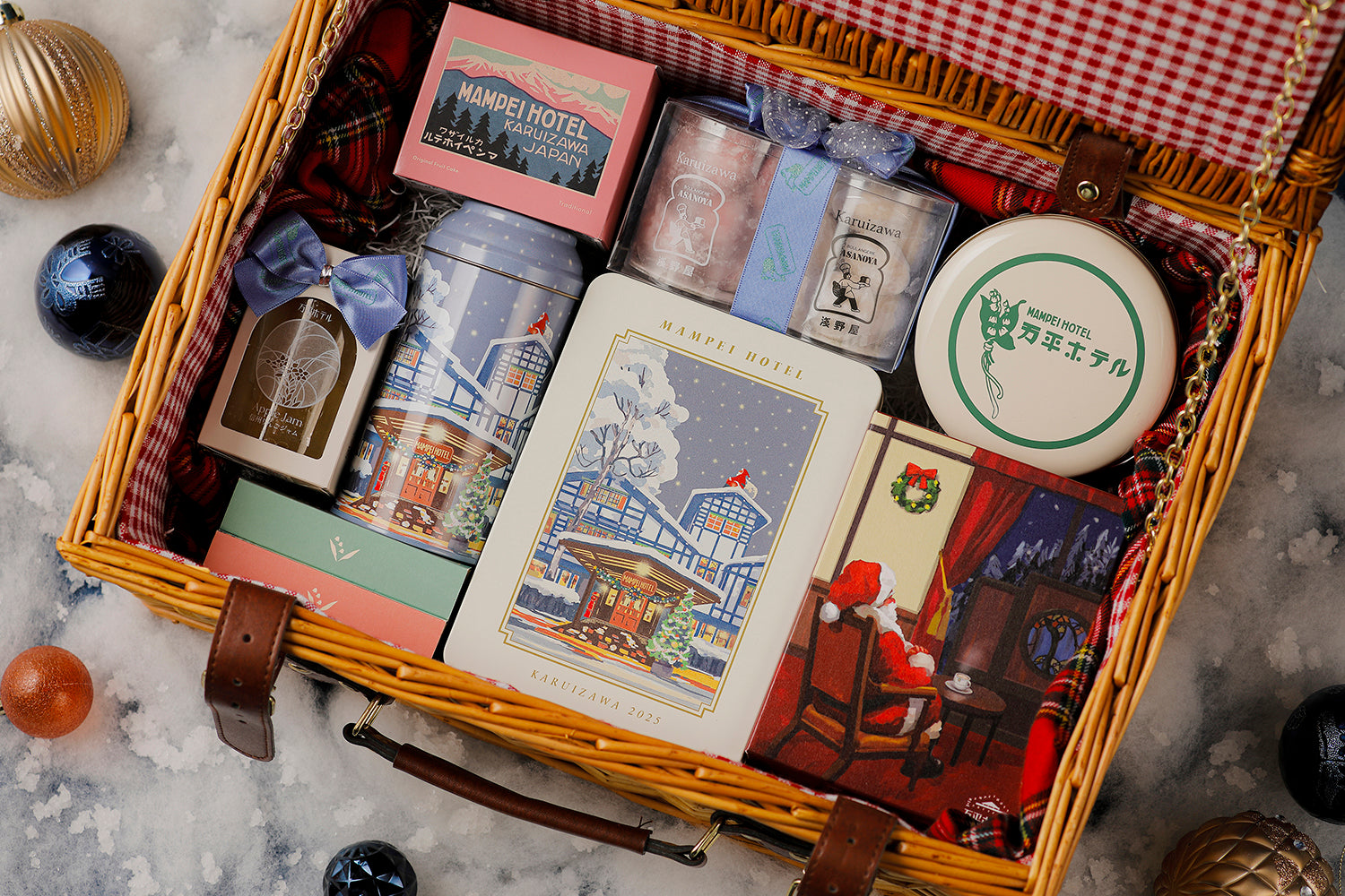 FEILERコラボハンカチ第3弾を含む計14点を詰め合わせた、20個限定の「万平ホテルプレミアムギフトハンパーXmas2025」。