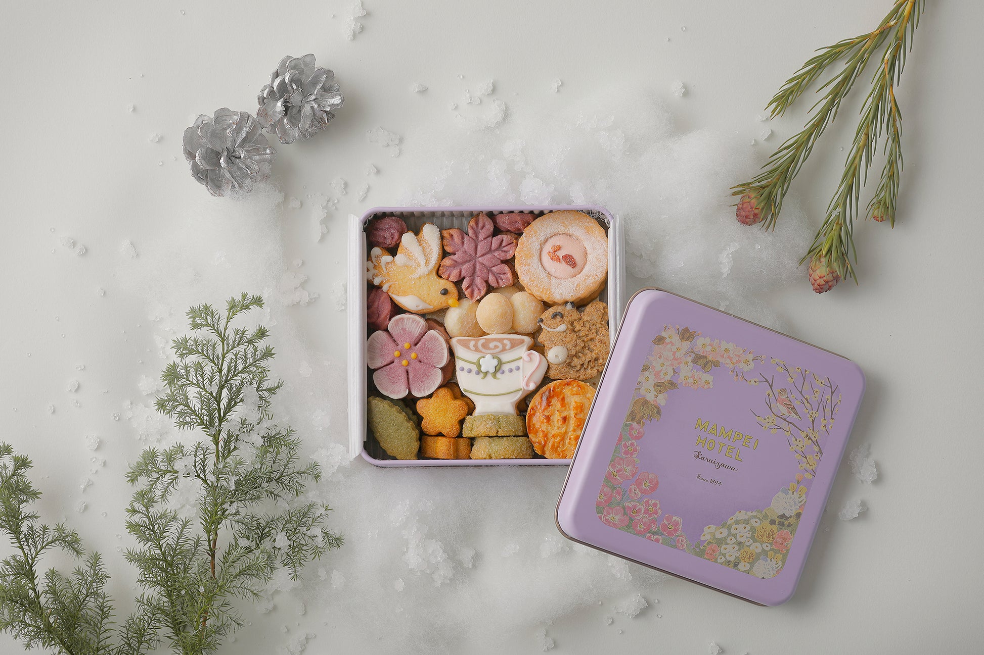 2025 年 8 月発売の「万平ホテル フラワークッキー缶」の第 2 弾として、雪景色の「カフェテラス」を表現した冬限定デザインが登場。ロイヤルミルクティーが注がれたすずらんのティーカップや、雪をまとった小動物をかたどったクッキーが並び、冬の軽井沢の情景を閉じ込めました。